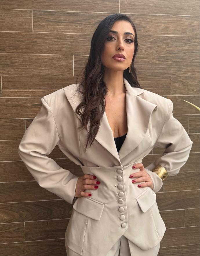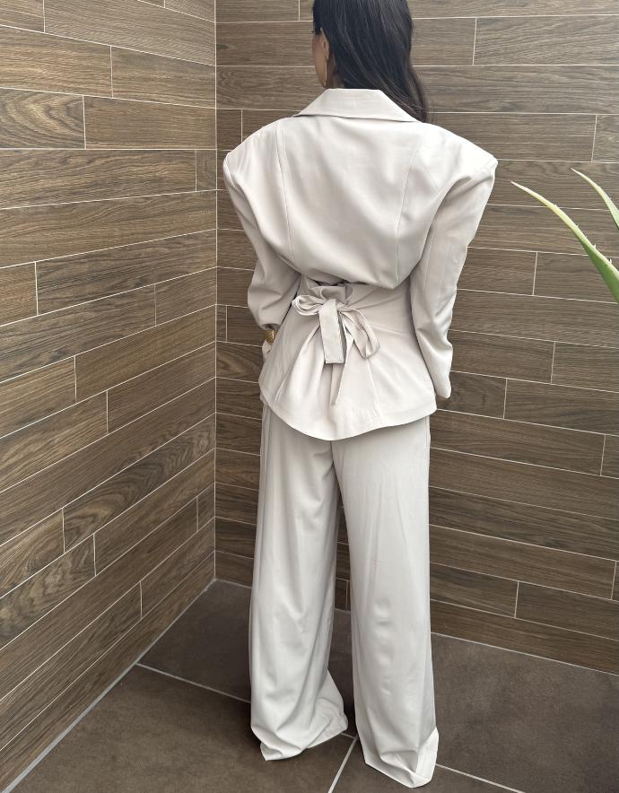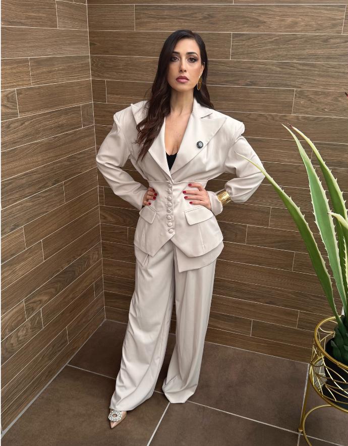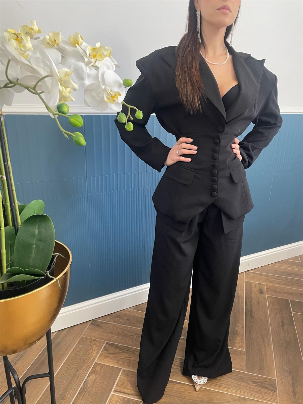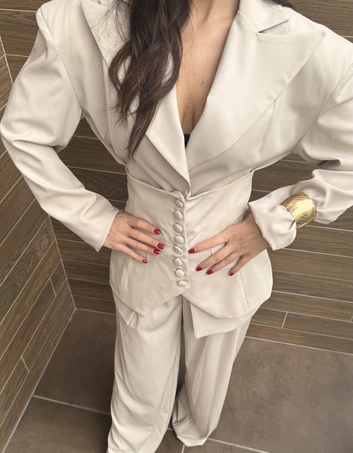 Il completo è composto da blazer strutturato, corsetto blazer con bottoni frontali e pantalone palazzo. Il corsetto blazer, regolabile sul retro, valorizza la silhouette creando un effetto vita definita e femminile. Può essere indossato sopra la giacca per un look più audace e fashion, oppure sotto per uno stile più elegante e strutturato.